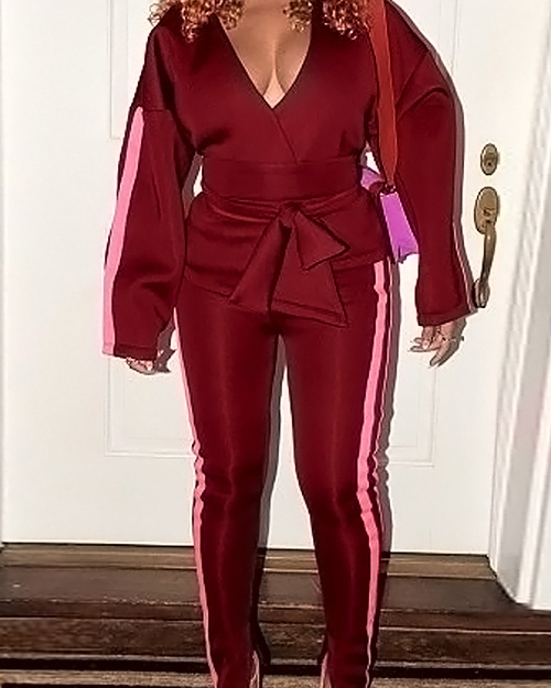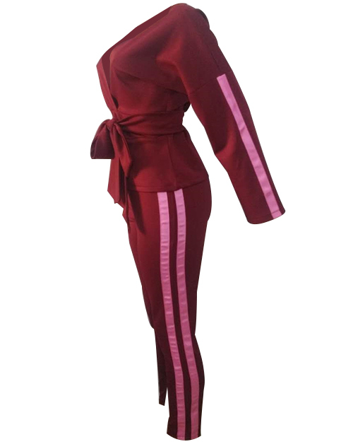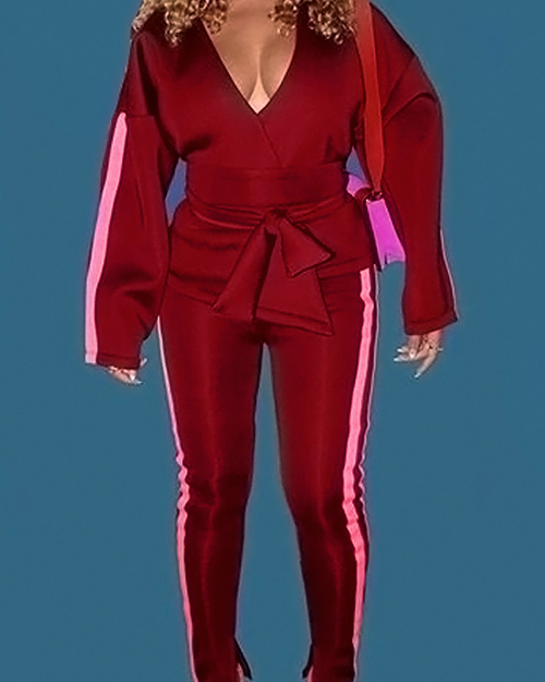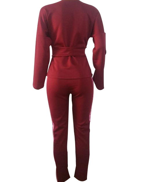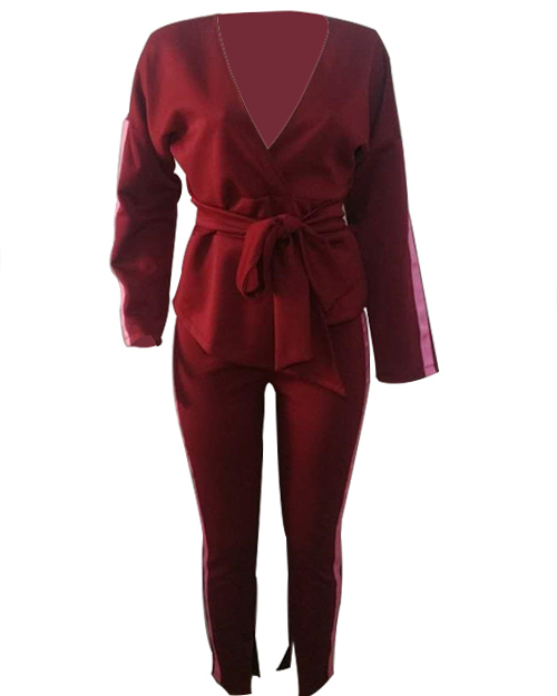 Leisure V Neck Striped Slit Hem Red Polyester Two-Piece Pants Set(With Belt)