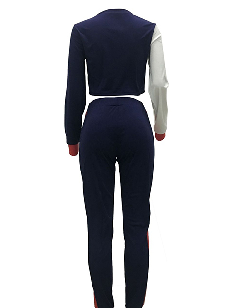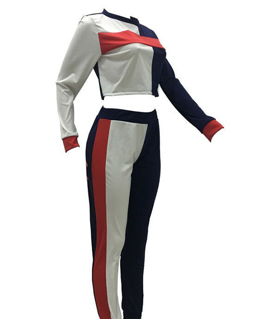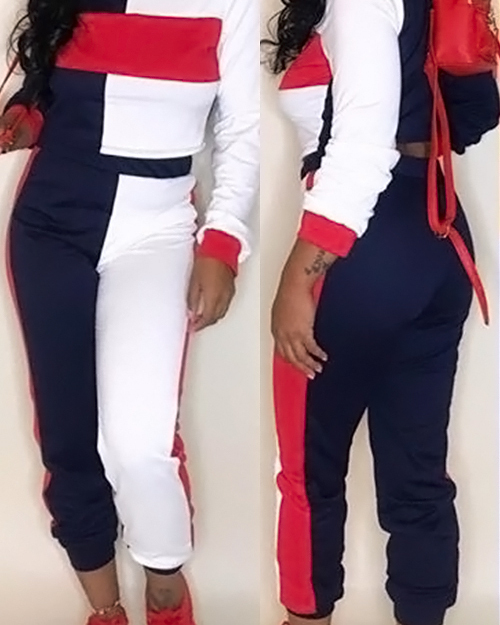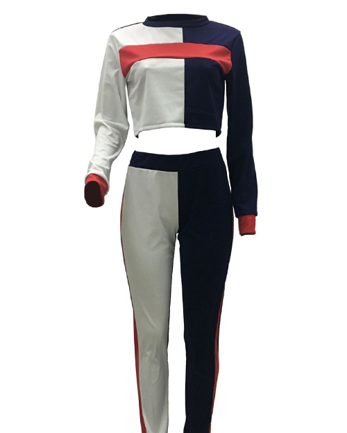 Multi Blending Pants Color Block O neck Long Sleeve Casual Two Pieces