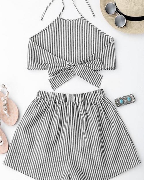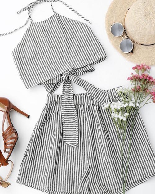 Multi Blending Shorts Striped O neck Sleeveless Casual Two Pieces