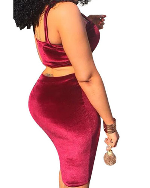 Red Velvet Skirt Solid Square Sleeveless Sexy Two Pieces