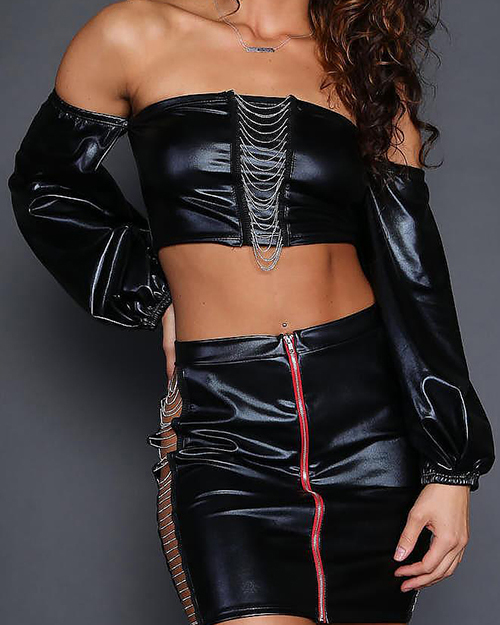 Sexy Bateau Neck Hollow-out Zipper Design Black PU Two-piece Skirt Set