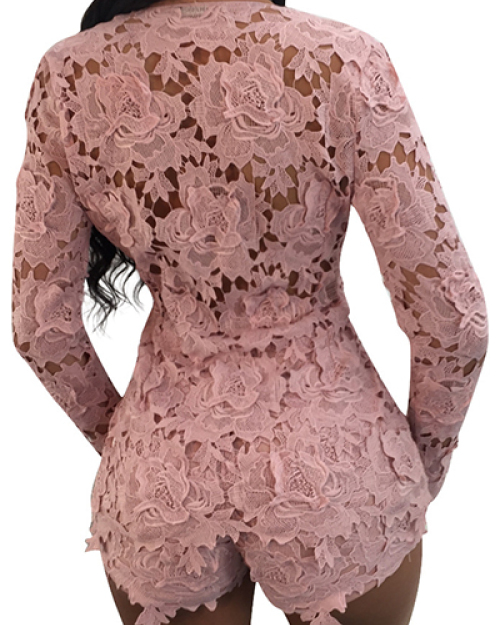 Sexy Deep V Neck Hollow-out Pink Lace Two-piece Shorts Set