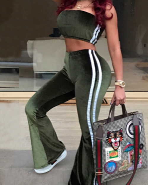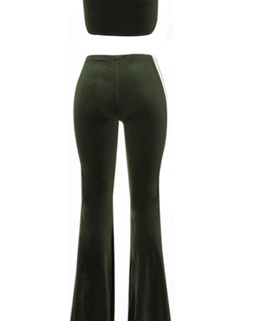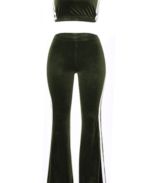 Sexy Dew Shoulder Striped Patchwork Army Green Velvet Two-piece Pants Set