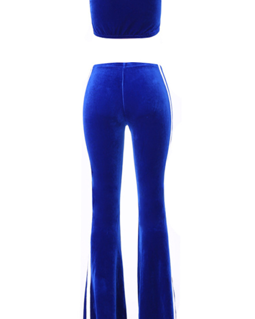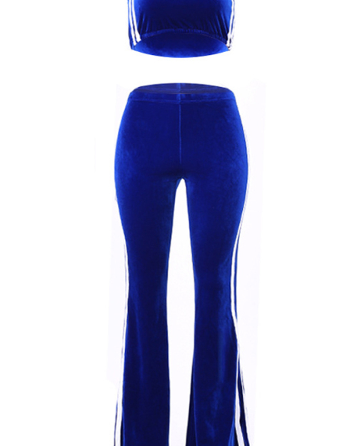 Sexy Dew Shoulder Striped Patchwork Blue Velvet Two-piece Pants Set