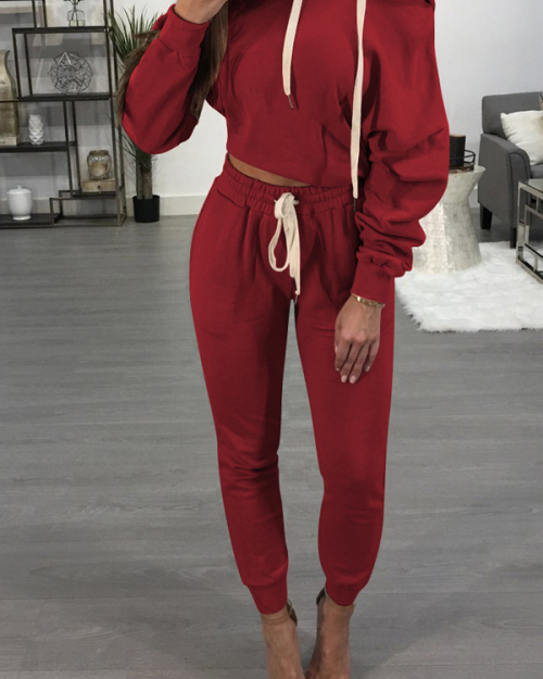 Sexy Hooded Collar Dew Shoulder Wine Red Polyester Two-piece Pants Set