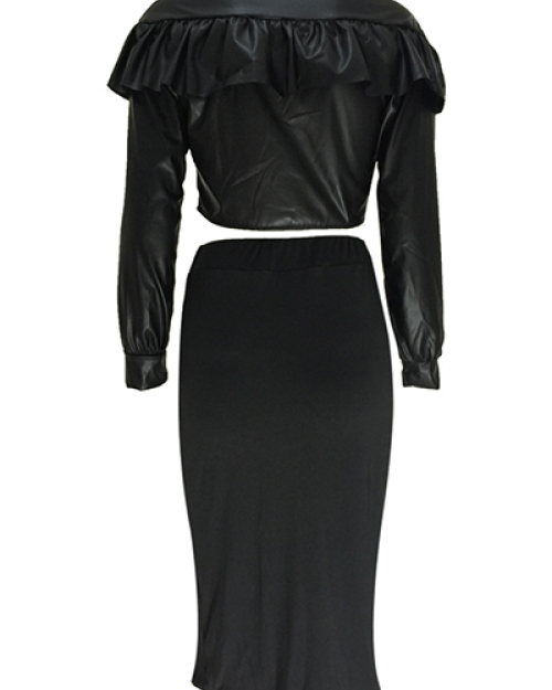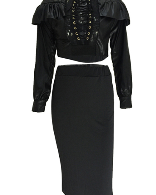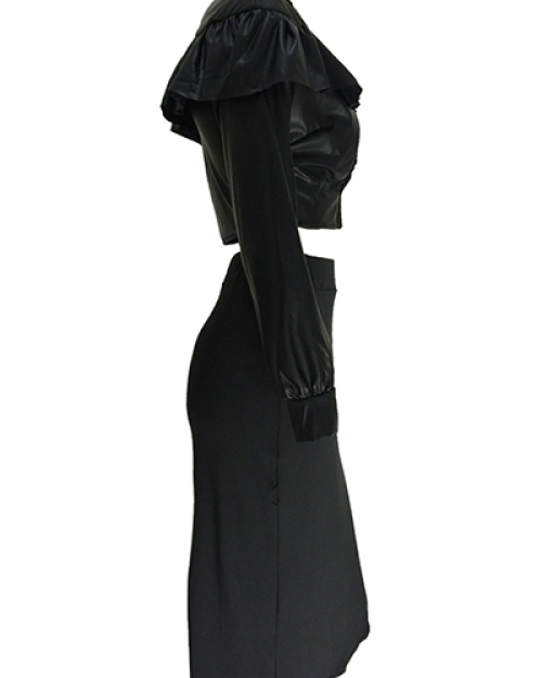 Sexy Mandarin Collar Long Sleeves Hollow-out Black Qmilch Two-piece Skirt Set
