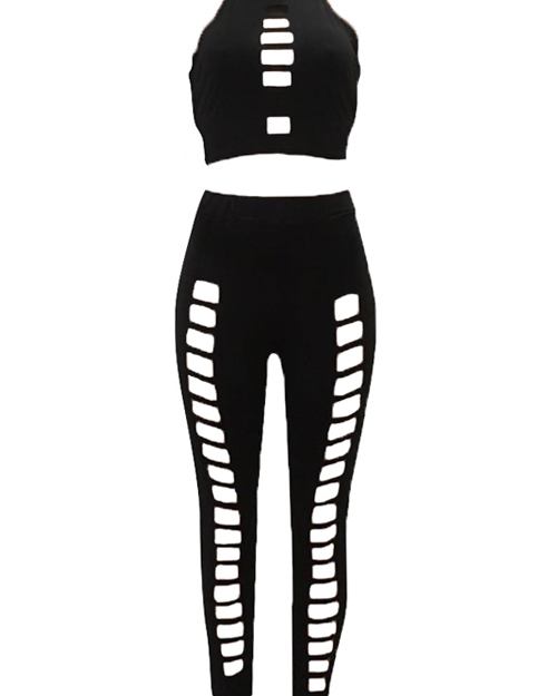 Sexy Round Neck Hollow-out Black Milk Fiber Two-piece Pants Set