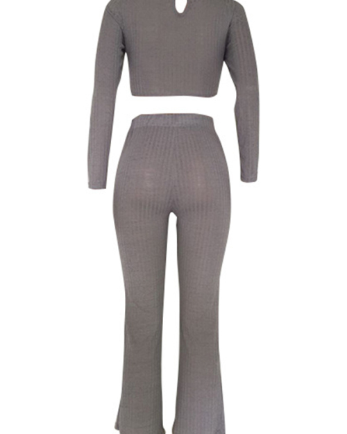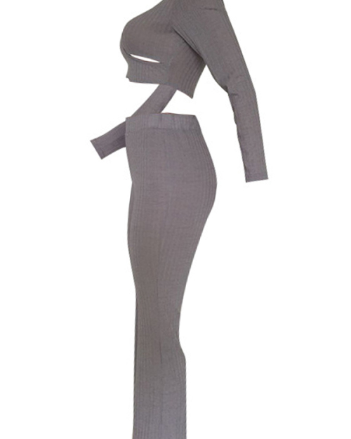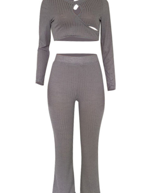 Sexy Round Neck Hollow-out Grey Cotton Two-piece Pants Set