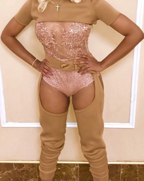 Sexy Round Neck Hollow-out Khaki Polyester Two-piece Pants Set(Without Subcoating)
