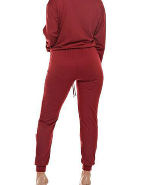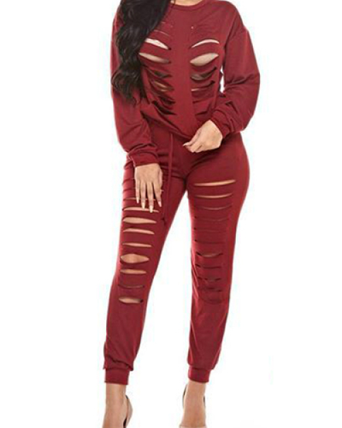 Sexy Round Neck Long Sleeves Hollow-out Red Twilled Satin Two-piece Pants Set