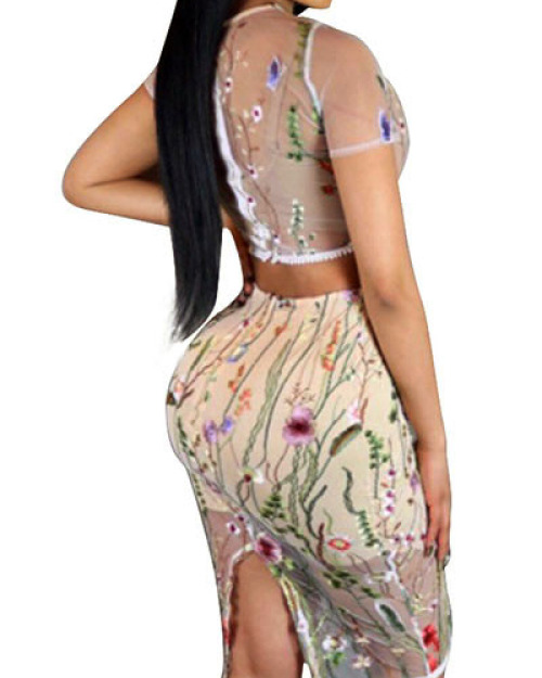Sexy Round Neck Short Sleeves See-Through Beige Polyester Two-piece Skirt Set