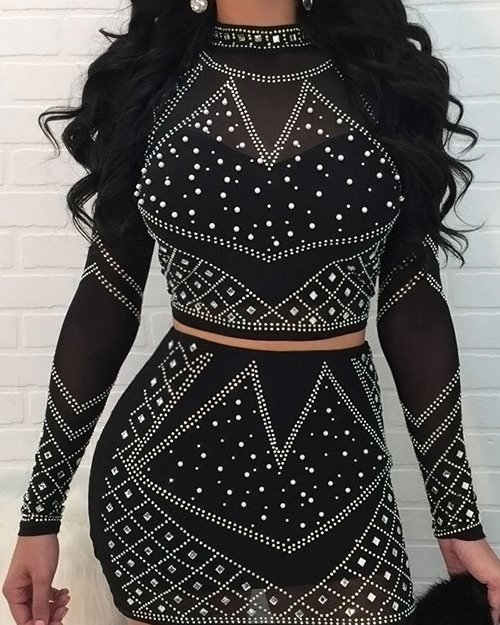 Sexy Turtleneck Hot Drilling Decorative See-Through Black Polyester Two-piece Skirt Set