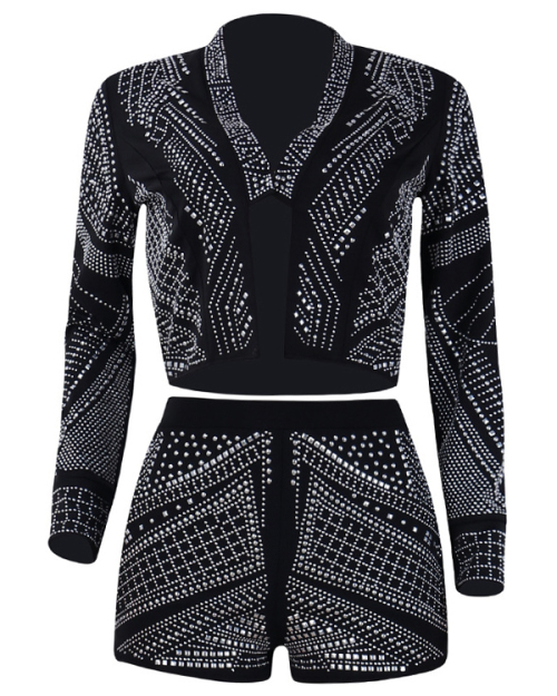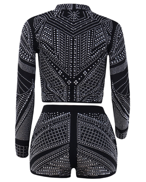 Sexy V Neck Diamante Decorative Black Qmilch Two-piece Shorts Set