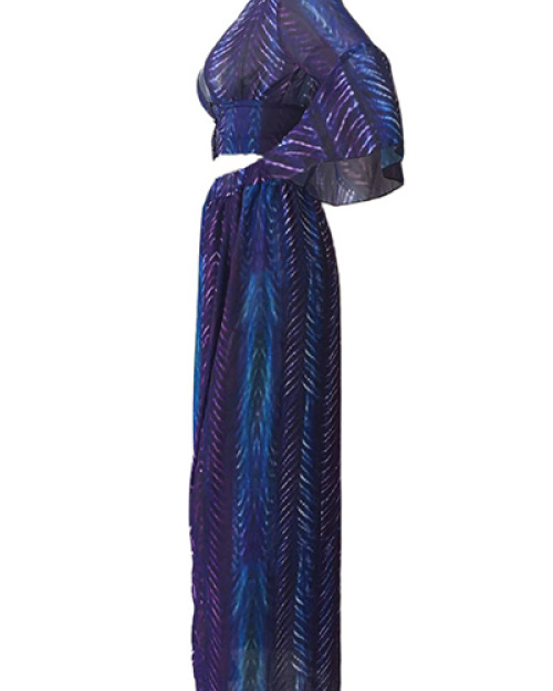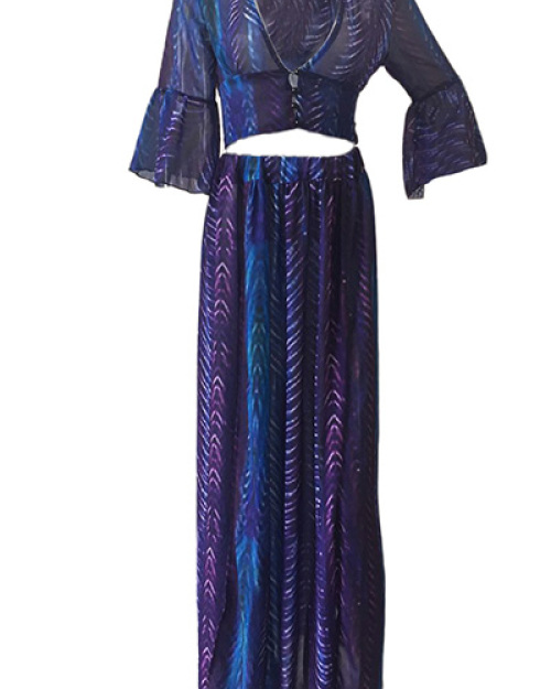 Sexy V Neck Half Sleeves Printed High SPlit Purple Chiffon Two-piece Skirt Set