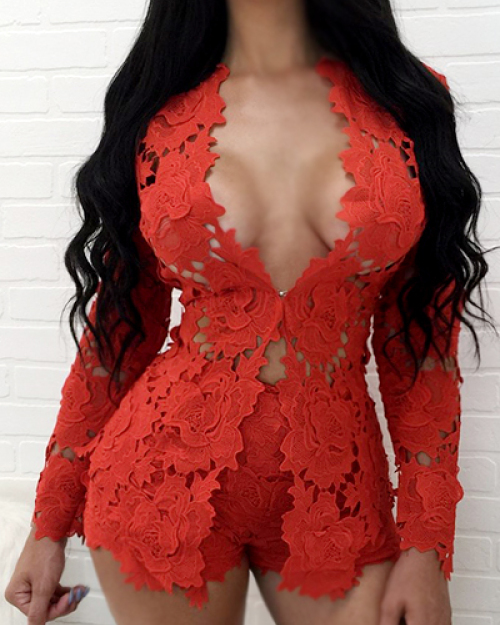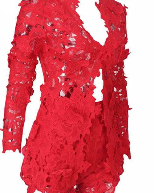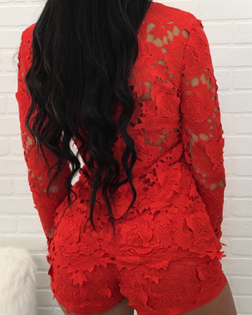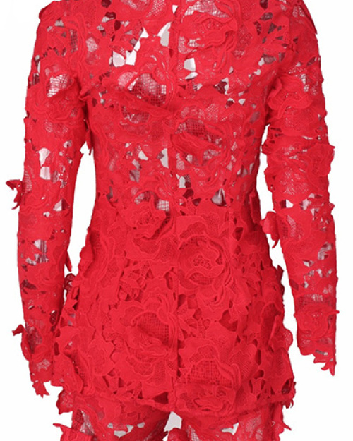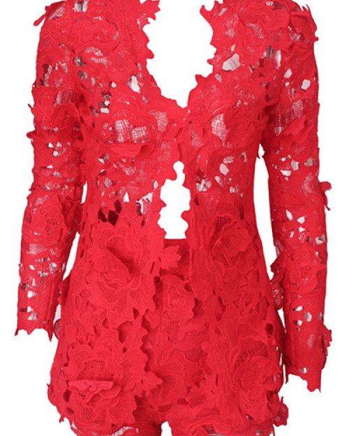 Sexy V Neck Long Sleeves Hollow-out Red Lace Two-piece Shorts Set
