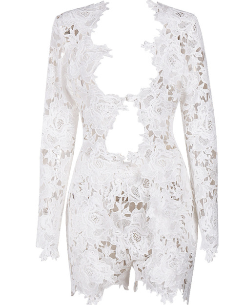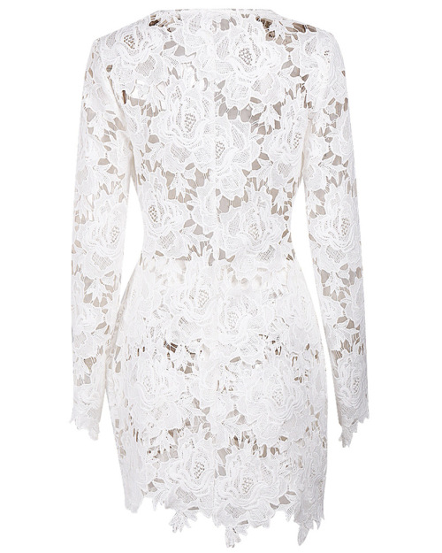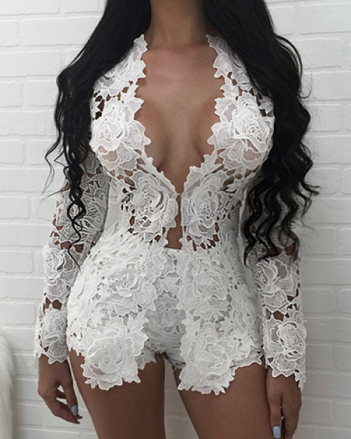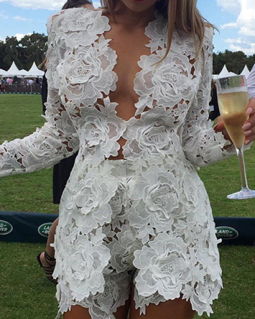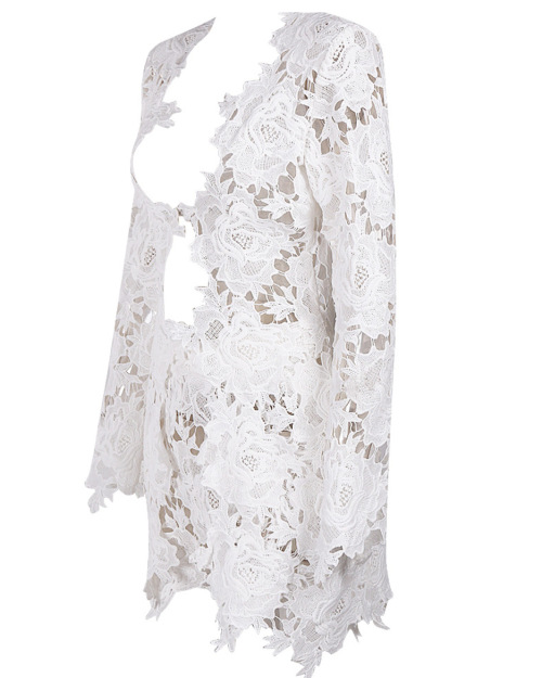 Sexy V Neck Long Sleeves Hollow-out White Lace Two-piece Pants Set