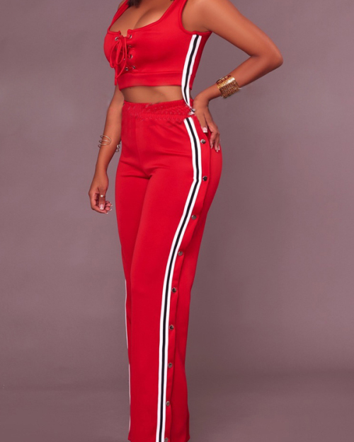 Sexy V Neck Side Split Red Polyester Two-piece Pants Set