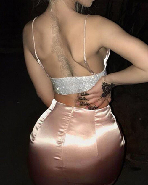 Sexy V Neck Sleeveless Patchwork Pink Satin Two-piece Skirt Set