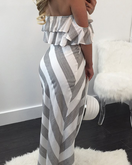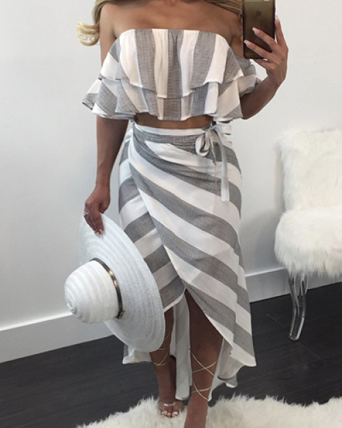 Stylish Dew Shoulder Striped Asymmetrical Grey-white Polyester Two-piece Skirt Set