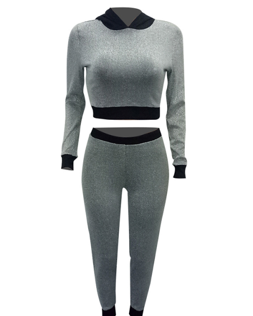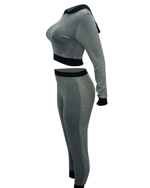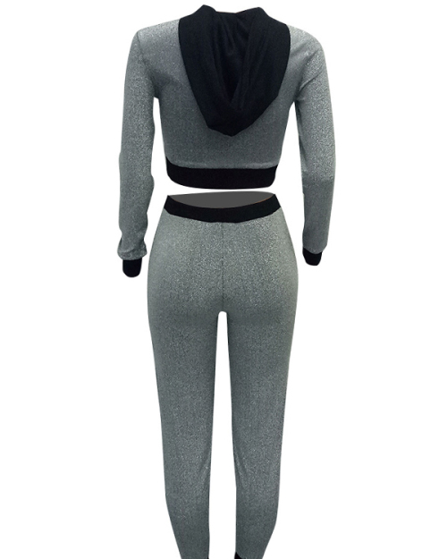 Stylish Hooded Collar Patchwork Grey Blending Two-piece Pants Set