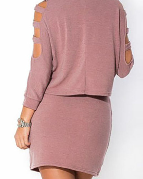 Stylish O Neck Long Sleeves Shoulder Hollow-out Purple Cotton Blend Two-piece Skirt Set