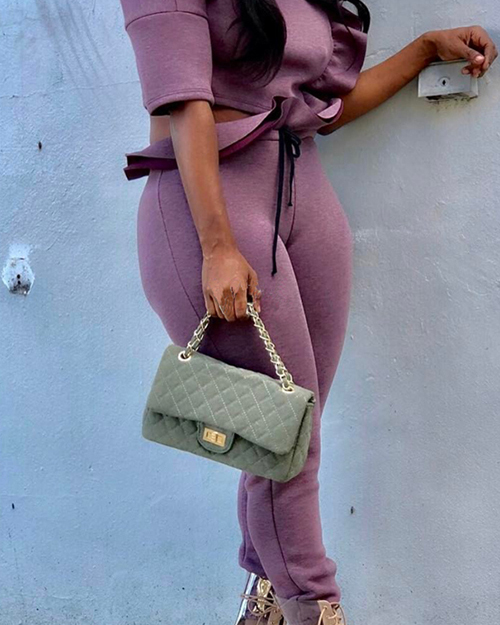 Stylish Round Neck Falbala Design Purple Polyester Two-Piece Pants Set