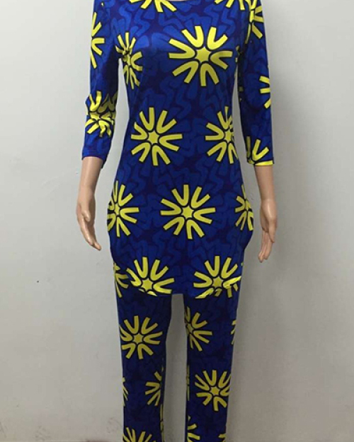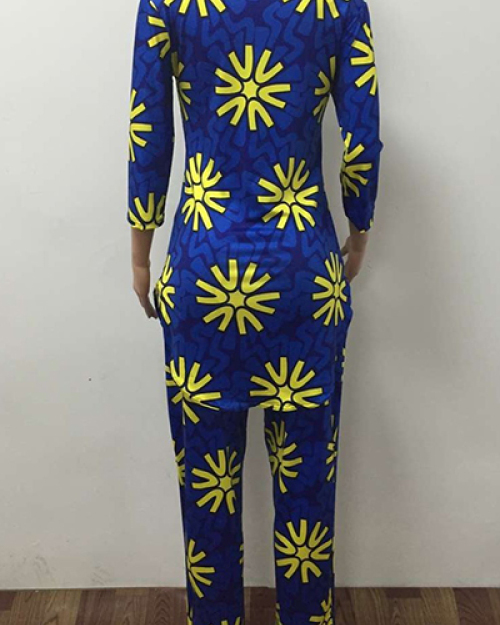 Stylish Round Neck Long Sleeves Floral Print Blue Qmilch Two-piece Pants Set