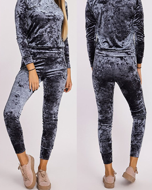 Stylish Round Neck Long Sleeves Grey Velvet Two-piece Pants Set