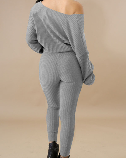 Stylish Sloping Shoulder Drawstring Grey Cotton Two-Piece Pants Set