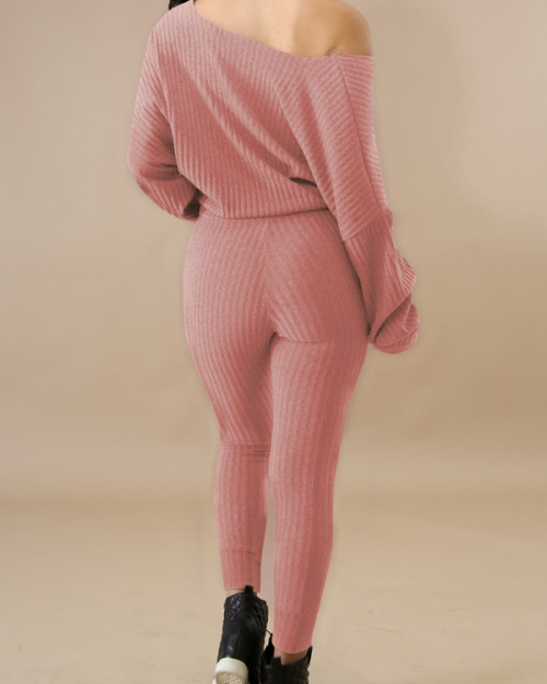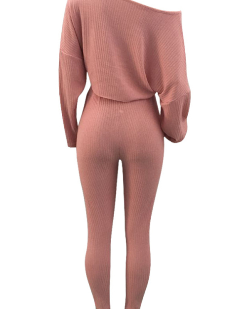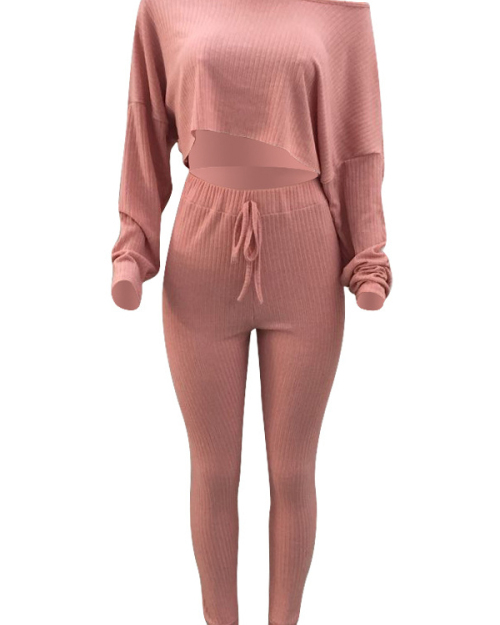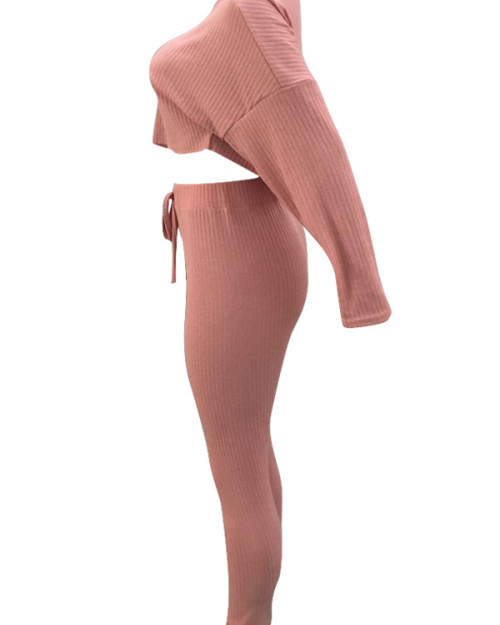 Stylish Sloping Shoulder Drawstring Pink Cotton Two-Piece Pants Set