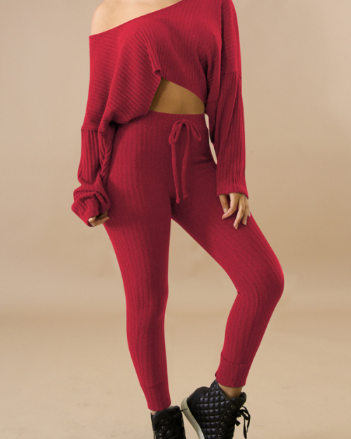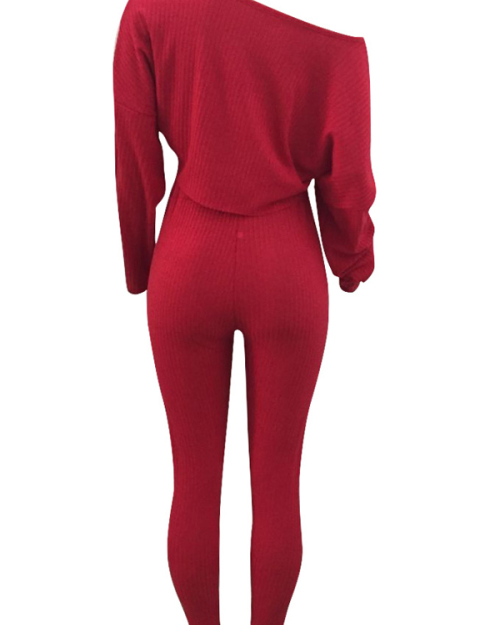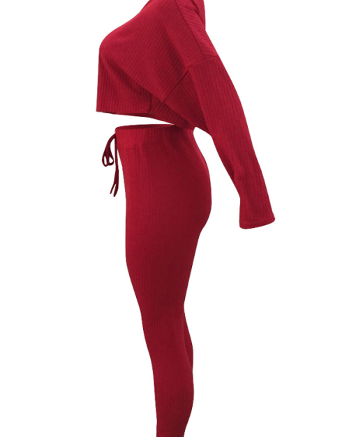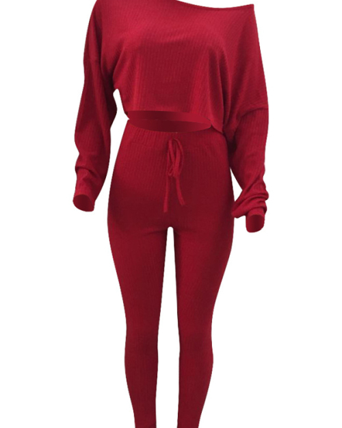 Stylish Sloping Shoulder Drawstring Wine Red Cotton Two-Piece Pants Set