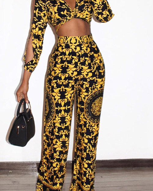 Stylish V Neck Printed Hollow-out Yellow Qmilch Two-Piece Pants Set