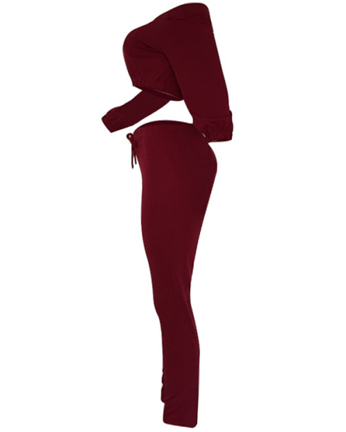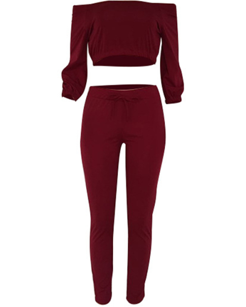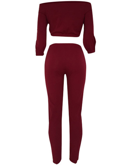 Trendy Bateau Neck Lacing Purplish Red Blending Two-piece Pants Set