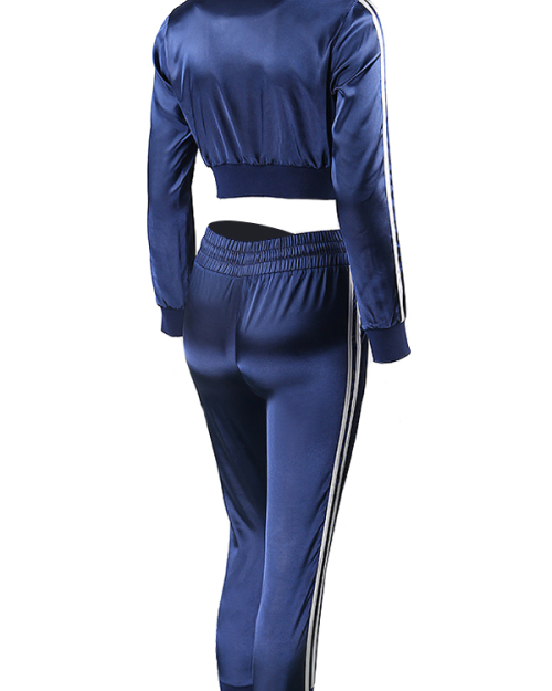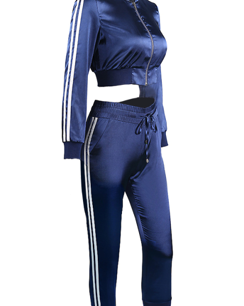 Trendy Mandarin Collar Long Sleeves Zipper Design Blue Polyester Two-piece Pants Set