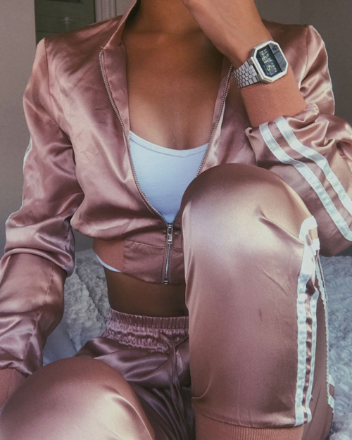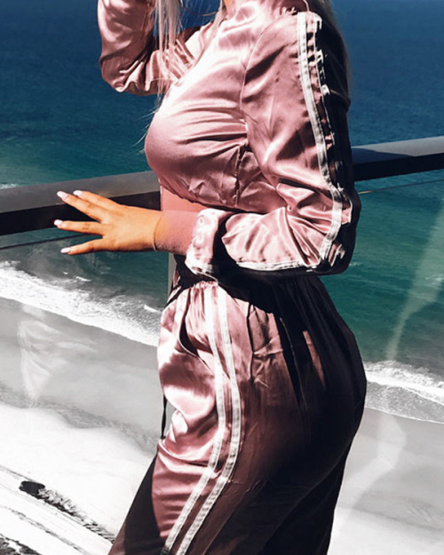 Trendy Mandarin Collar Long Sleeves Zipper Design Pink Polyester Two-piece Pants Set