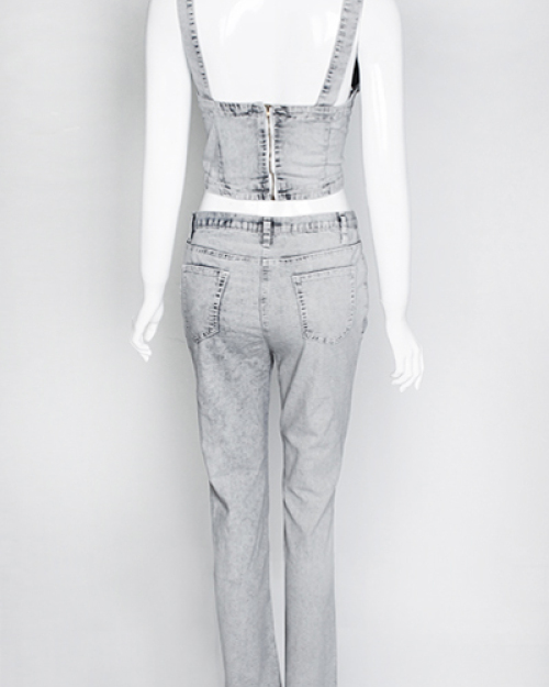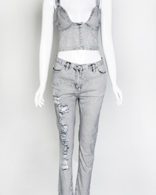 Trendy V Neck Sleeveless Broken Holes Grey Denim Two-piece Pants Set