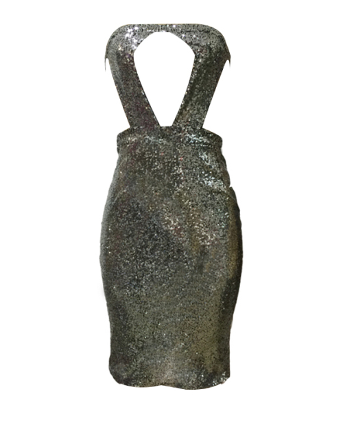 Vintage Bateau Neck Sequins Decoration Hollow-out Silver Polyester Mid Calf Dress
